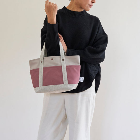 10月10日はトートの日。トートの日にあわせて発売したコンパクト2WAYトートは、“毎日使いたくなるバッグ”をテーマに、使いやすさと手触りの良さにこだわりました。気兼ねなく日々使っていきながら、バッグが味わい深く変化していく様子もお楽しみください。 アクセントとして使用しているストライプ柄の生地は、染め糸で織り上げた10号帆布を使用しています。吸い込まれそうになるほどの規則正しい織り目は、複数の色糸(タテ糸)から形成されており、プリントでは表現できない立体的な手触りと鮮やかな織り柄が楽しめます。シャトル織機でゆっくり織ることで生地はふっくらとした仕上がりに、柔らかくしっとりとした感触も味わえます。 ボディの生地は厚手6号帆布を使用しています。底が2重になっているため型崩れせず床に置いても自立します。帆布らしい粗い織り目が特長ですが、上質な綿100%のコーマ糸を使用することで、肌ざわりはしっとりと滑らかに。使うほどに柔らかく変化します。 間口にファスナーが付いており、中身が見える心配がなく、貴重品も安心して入れられます。荷物の出し入れが多い時には、ストライプのマチ部分を内側に折り畳んでオープンタイプとしてお使いください。 マチがしっかりとあり見た目以上に収納力があります。ポケットは内外に1つずつ、ショルダーは取り外しが可能です。 帆布のバッグは、経年変化も楽しみのひとつです。お使いいただきながら、味わい深くなっていくバッグを育んでみてください。カラーはキナリと黒の2色をご用意しています。