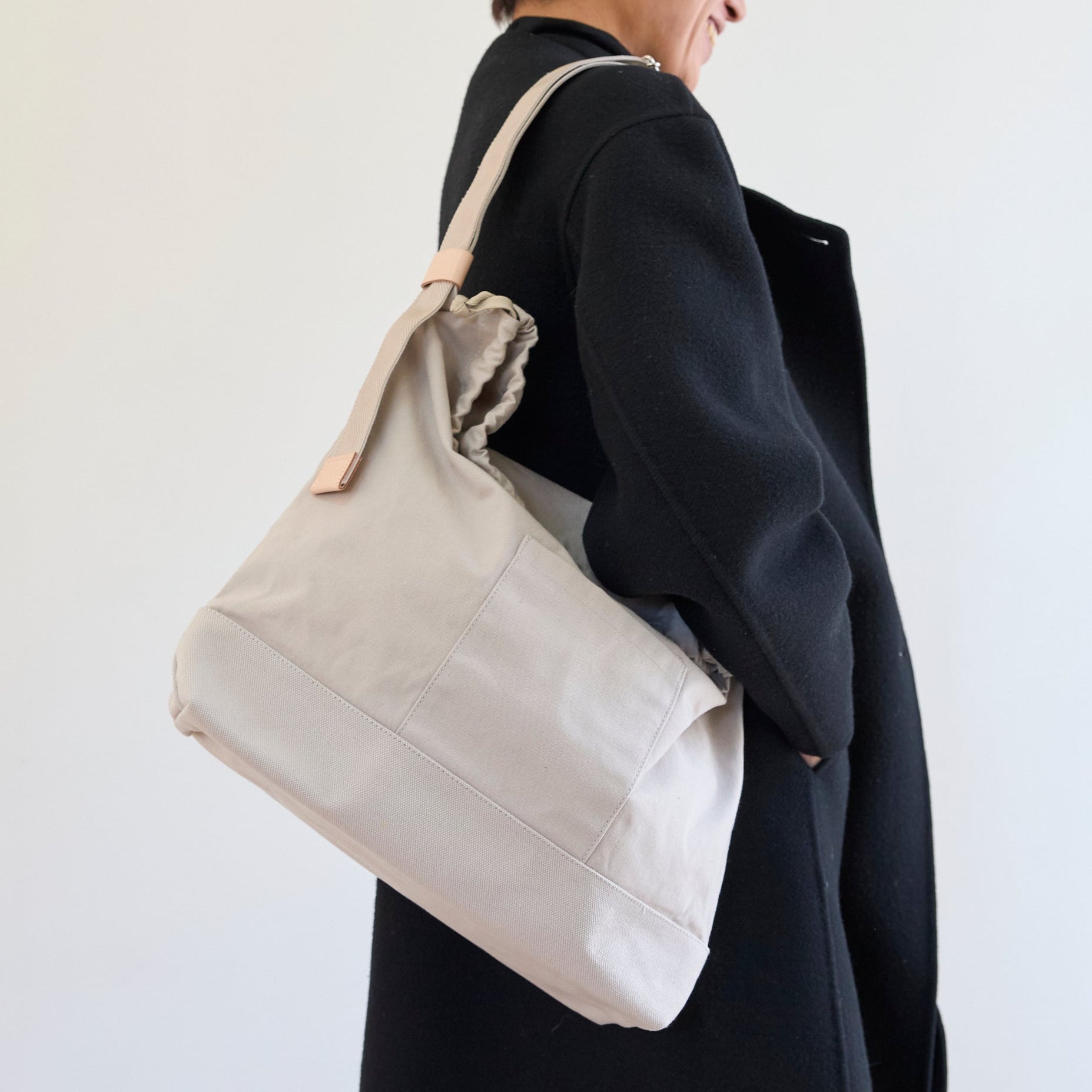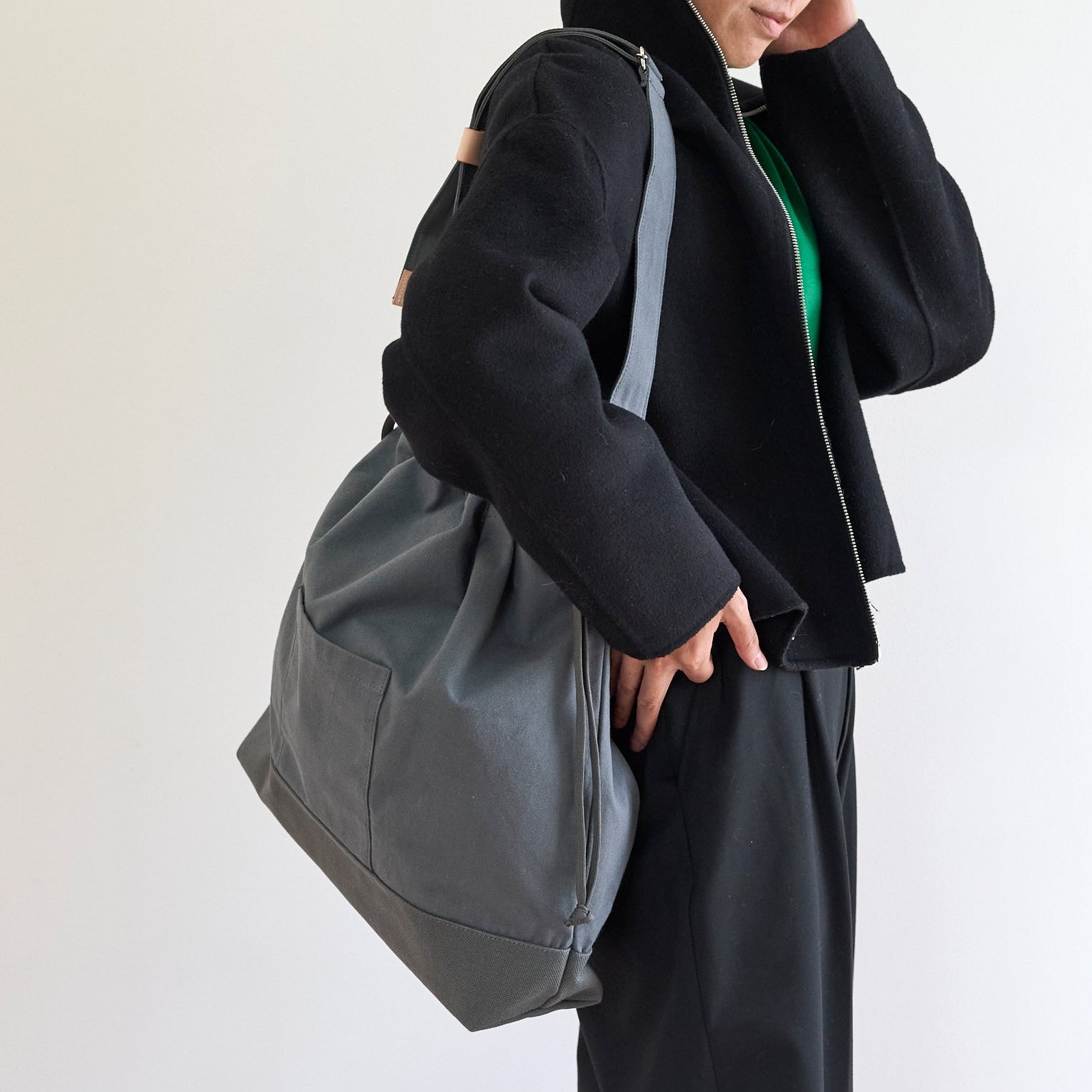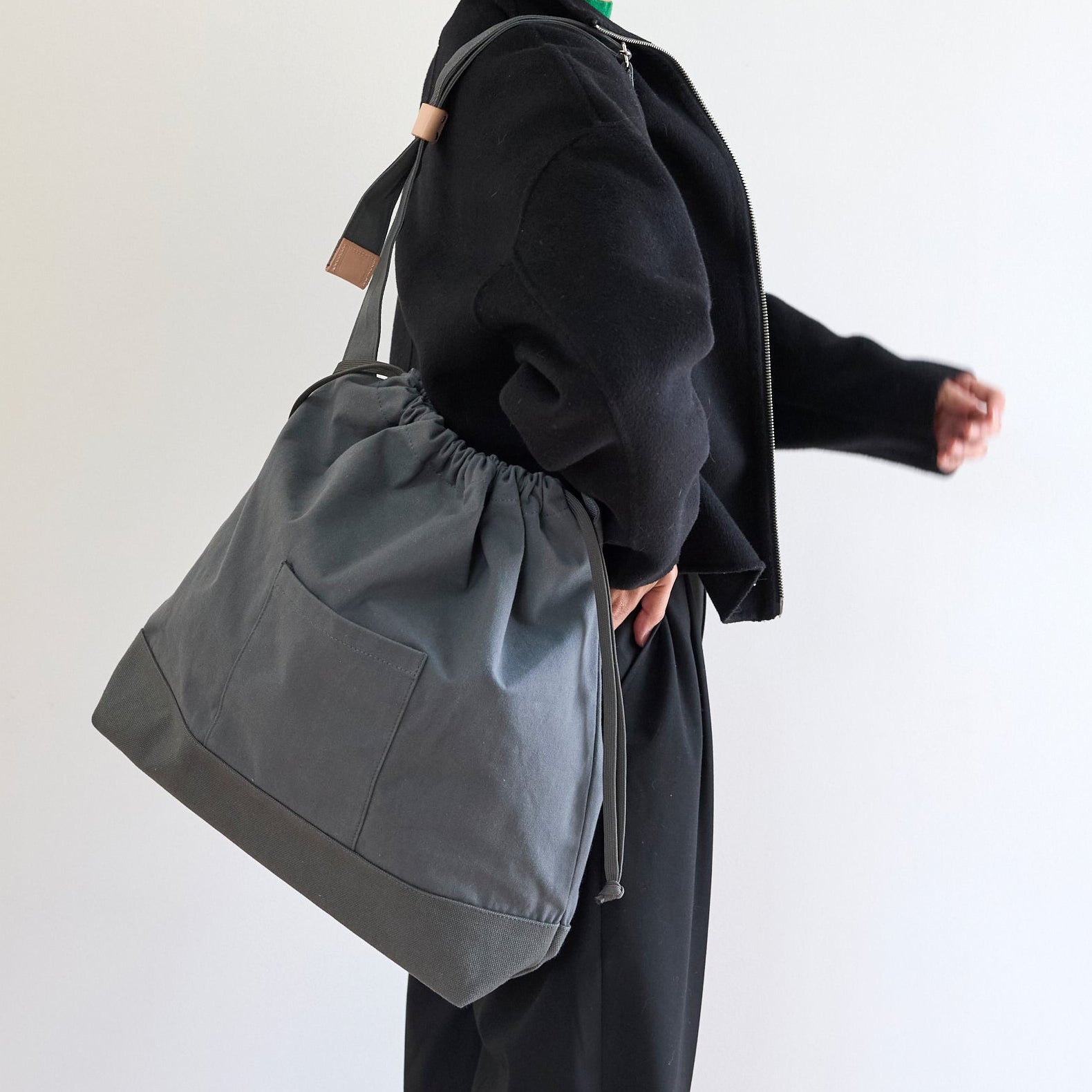 間口の紐の締め方によってカジュアルな印象になるため、男性にもおすすめです。