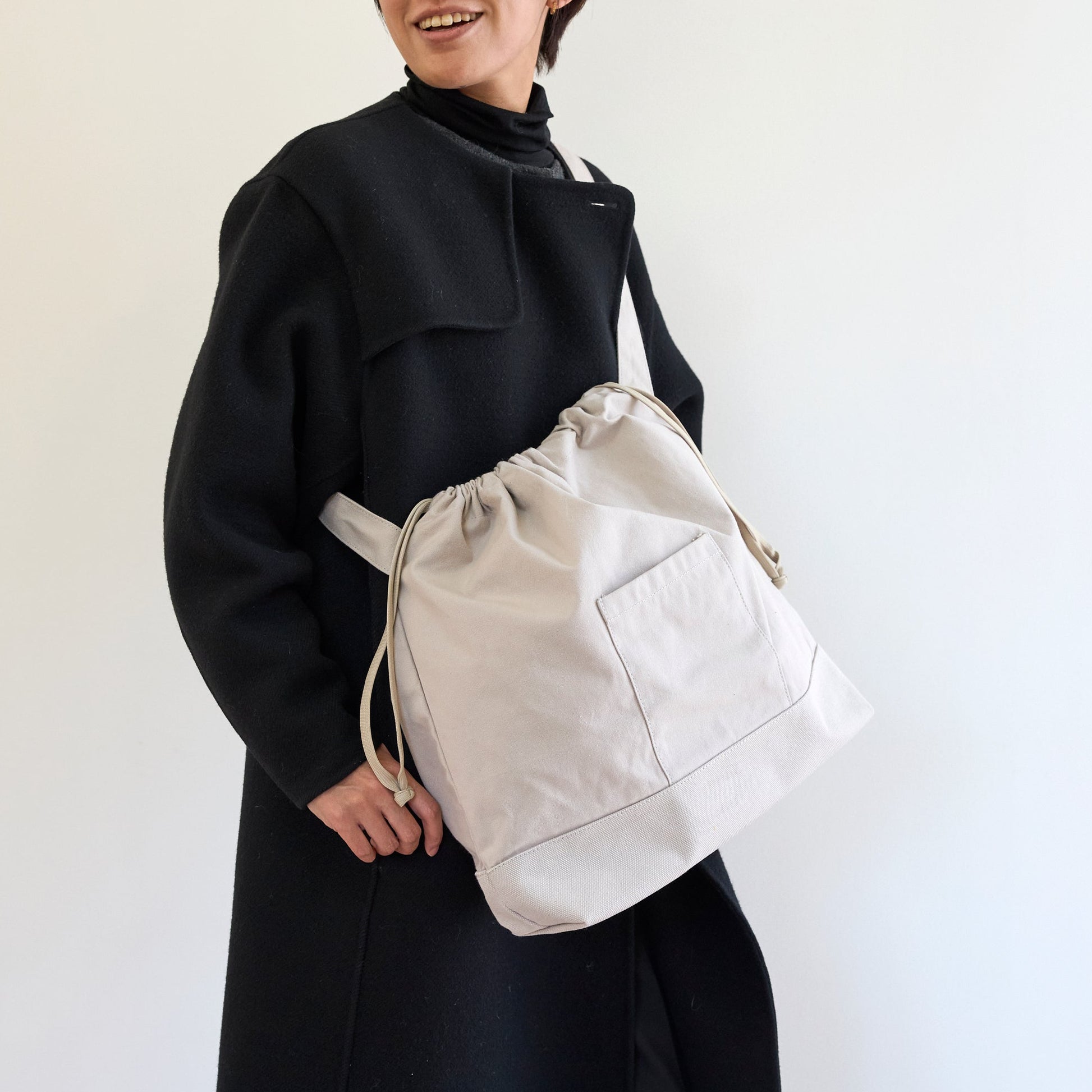 コロンとした印象の巾着バッグ