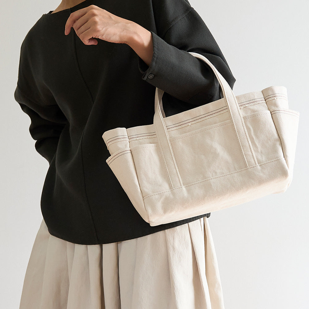 多くの方に愛されていたセルヴィッジトートをモチーフにデザインし、たっぷり収納できる幅広のマチと、使いやすい外ポケットを設けました。普段のお出かけにぴったりのトートバッグです。